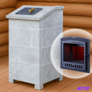 ✓ печи комплект с облицовкой: к топочному агрегату с чугунным коробом, увеличенной стартовой трубой добавляется набор плит из природного камня с креплениями для сборки облицовки и дверца для пара.