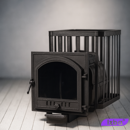 Стильный вид чугунной печи-каменке с прочной и вместительной сеткой из кованой стали придает окраска поверхностей кремнийорганической эмалью цвета «антрацит» и оригинальное оформление дверцы в форме арки с термостойким панорамным стеклом. Выносная топка с каналом длиной 30 см позволяет организовать комнату отдыха в смежном с парилкой помещении, где осуществлять закладку дров на порядок комфортнее. Внушительные габариты стекла в дверце и система обдува для защиты от копоти и запотевания позволяют наслаждаться игрой пламени и контролировать расход топлива.